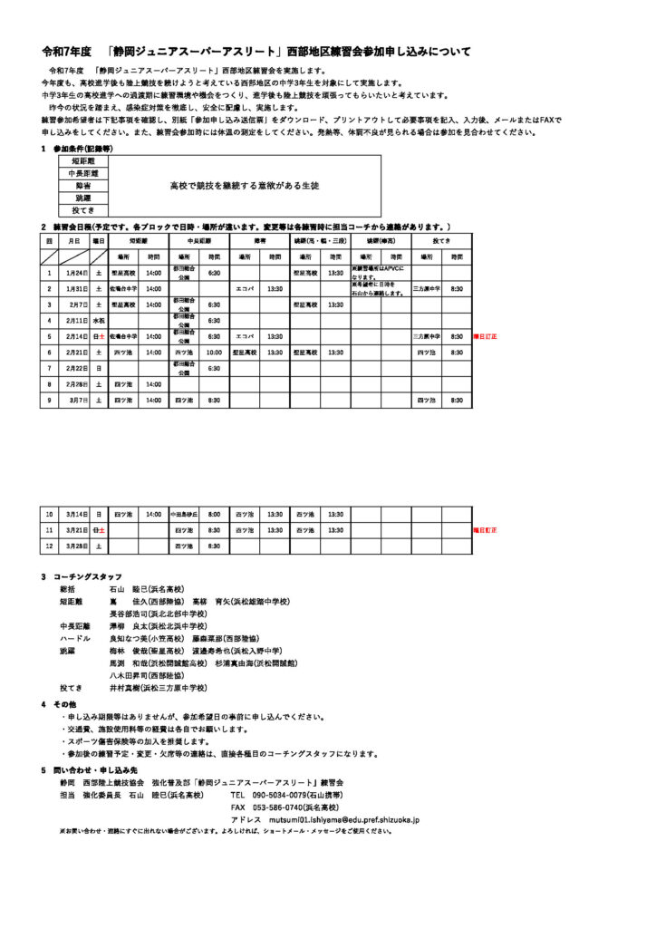 静岡ジュニアスーパーアスリート練習会要項